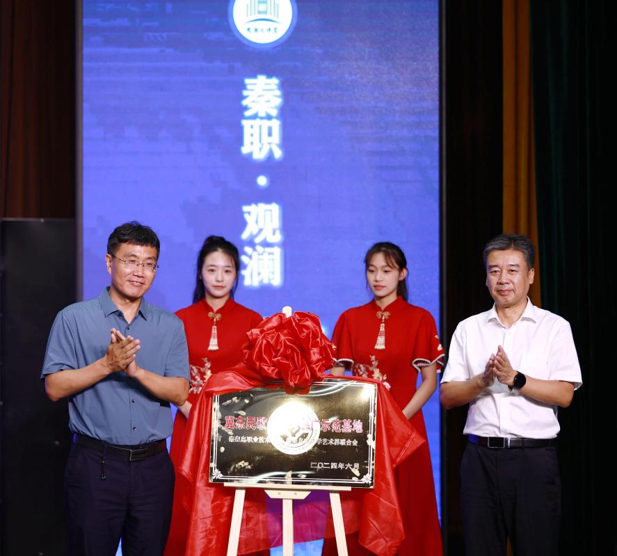 学院党委书记、院长蔡大勇、秦皇岛市文学艺术界联合会副主席翟振刚为“冀东民歌传承与推广示范基地”揭牌