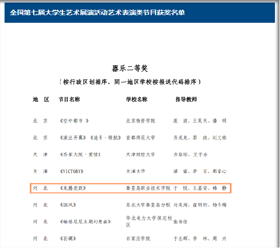 近日,由教育部办公厅举办的全国第七届大学生艺术展演活动评选结果揭晓,我系于悦、韩静等老师指导的《龙腾虎跃》作品荣获国家级艺术表演类器乐二等奖。此次佳绩的取得充分展现了我系美育工作的丰硕成果,也为学院美育工作实现了又一次历史性突破!