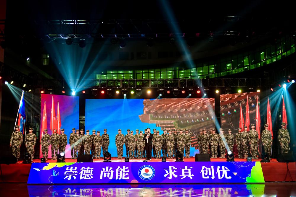 晚会开场,活力四射的拉拉操《青舞飞扬》率先登场。表演者们动作整齐划一、舞姿灵动轻快,用饱满的热情瞬间点燃现场氛围,台下新生掌声与欢呼声此起彼伏;情景剧《开学第一天》则以细腻生动的演绎,还原了新生初入校园时的好奇探索与对未来的憧憬期待,熟悉的场景引发全场新生强烈共鸣;随后,戴文强老师携手学院教官团、国旗护卫队共同带来合唱《复兴的力量》,铿锵有力的歌声搭配庄重整齐的队列,不仅展现出昂扬向上的精神风貌,更将青年学子的爱国情怀与责任担当传递给在场每一位观众;艺术系学子的民族舞表演《绣在穿引间》切换至柔美深邃风格,以舒展舞姿、精致服饰,尽显东方古典韵律魅力,让新生沉浸式感受中华优秀传统文化的深厚底蕴。