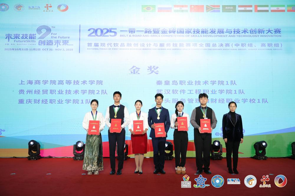 【新闻中心讯】10月31日至11月2日,2025一带一路暨金砖国家技能发展与技术创新大赛——首届现代饮品融创设计与服务技能赛项(高职组)决赛落下帷幕。学院代表队刘明月、杨瑞萱、张喻喆、赵冶4名学生获大赛金奖,学院荣获“最佳组织奖”。