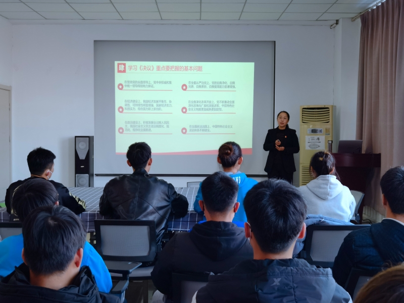 【新闻中心讯】12月1日,机电工程系党总支在机电工程中心405召开十九届六中全会精神宣讲会。系党总支书记王金枝主讲,其所联系班级3200701班全体同学参加。