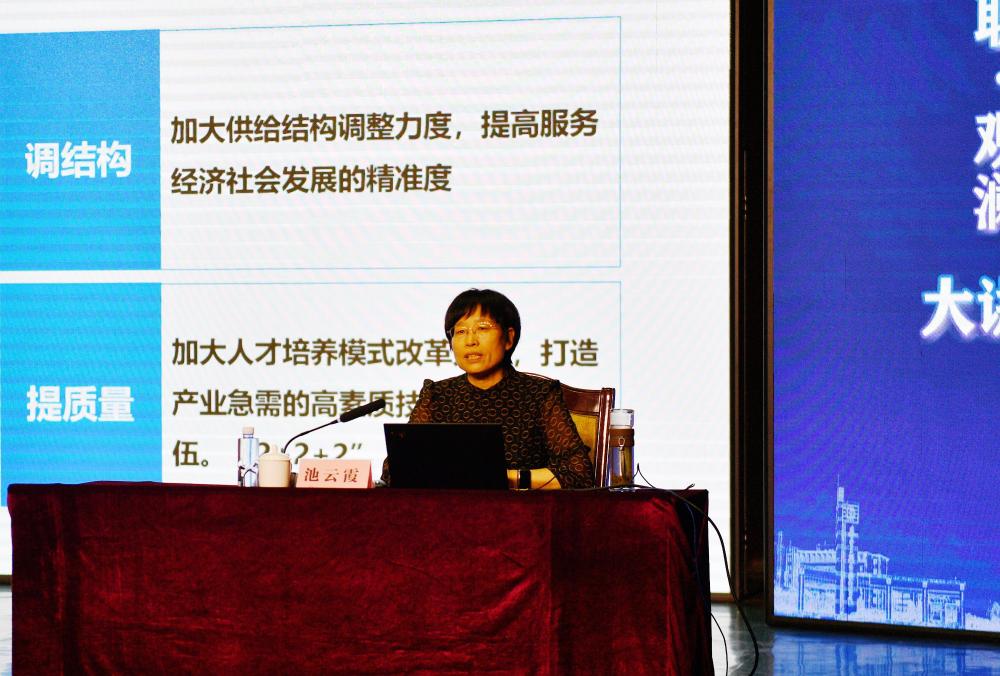 池云霞教授以《学经验、懂政策、找抓手——教育高质量发展的几点思考》为题,系统解读了国家、河北省的职业教育政策,深入分析了当前职业教育的核心任务点以及未来职业教育的发展方向,重点介绍了国家“双高计划”建设院校的典型案例和经验。