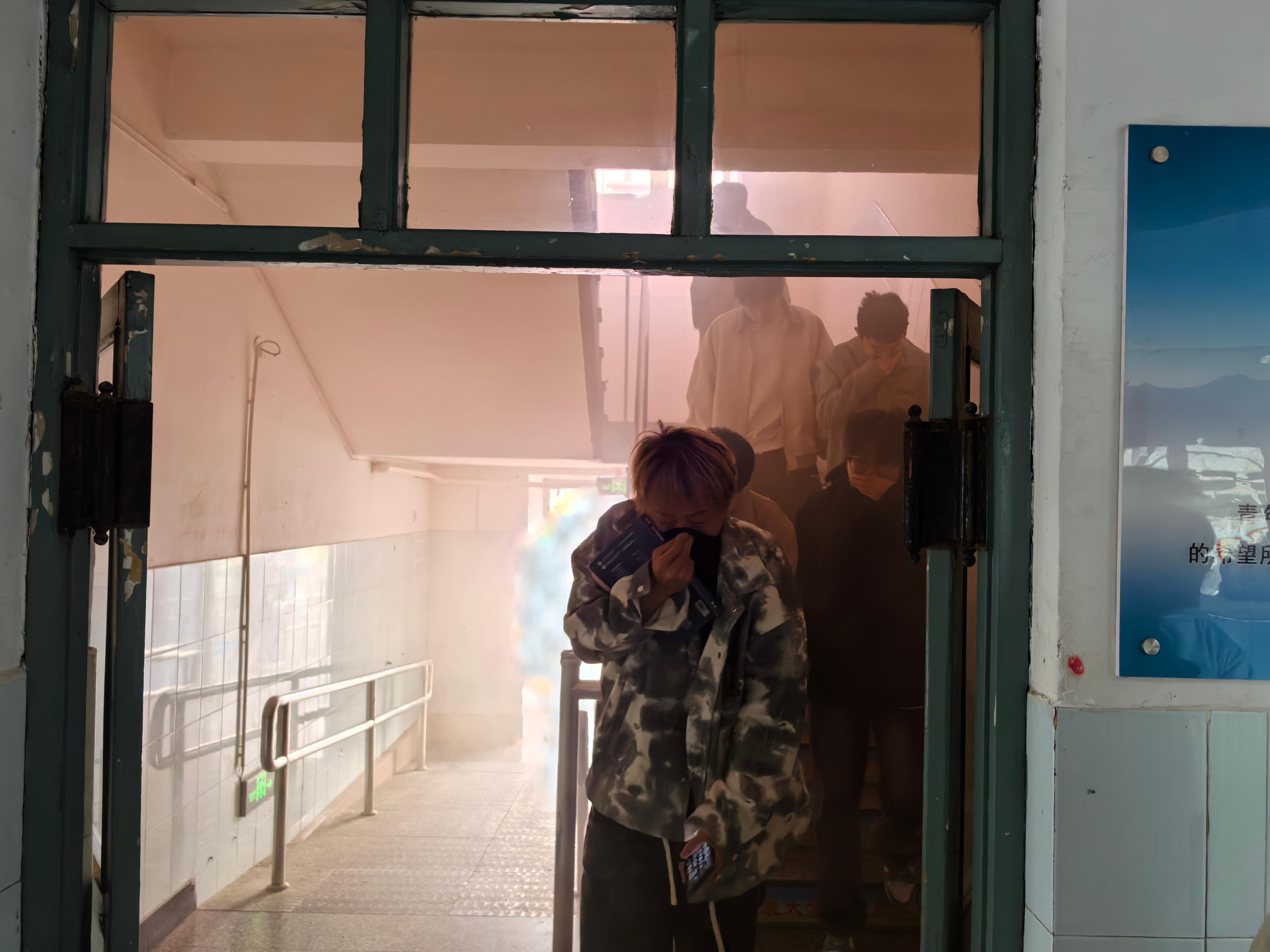 在5号公寓楼开展的突发火情仿真演练,全程未作预先通知。随着二楼烟雾弹触发烟感报警,排查现场瞬间转为应急战场。学工教师迅速组织学生有序避险疏散;公寓管理员即刻切断闸机电源、开放疏散通道并上报情况;校内安保力量闻警而动,快速完成救援、疏散、灭火、警戒及断电等工作。学生或紧急撤离,或依规范在宿舍开展自救、固守待援,整个处置流程紧密衔接,基本契合学院消防应急处置预案要求。